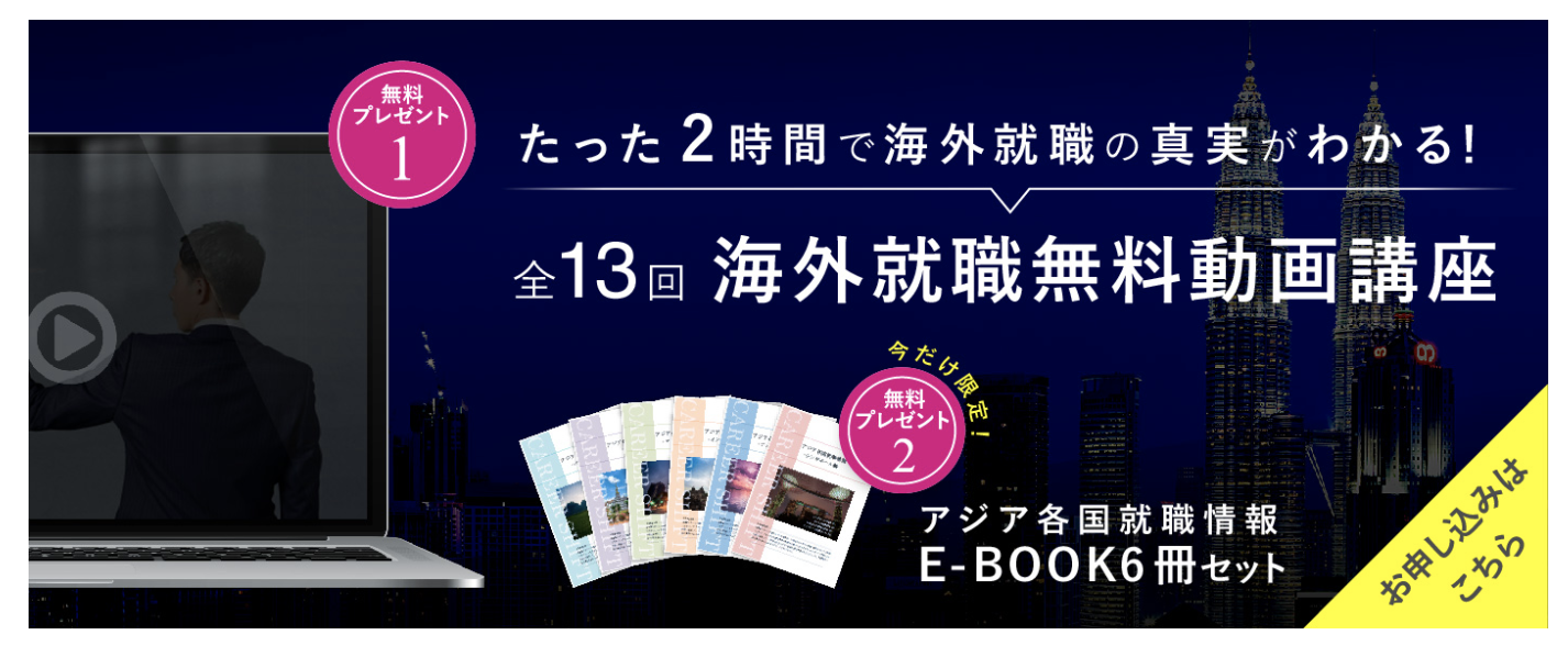 ここまで読んでいただいてアジア海外就職に興味を持っていただいた方は是非、下記の全13回アジア海外就職無料動画講座にご登録いただけますと幸いです。