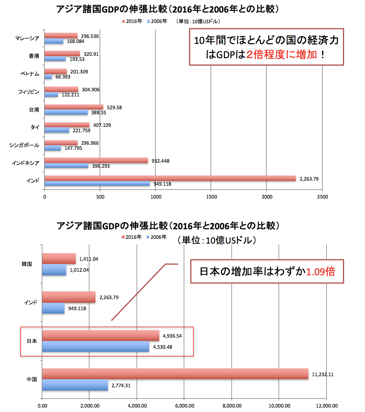 以下は、日本を含むアジアの現在の経済力(GDP)と10年前の経済力を比べたグラフになります。