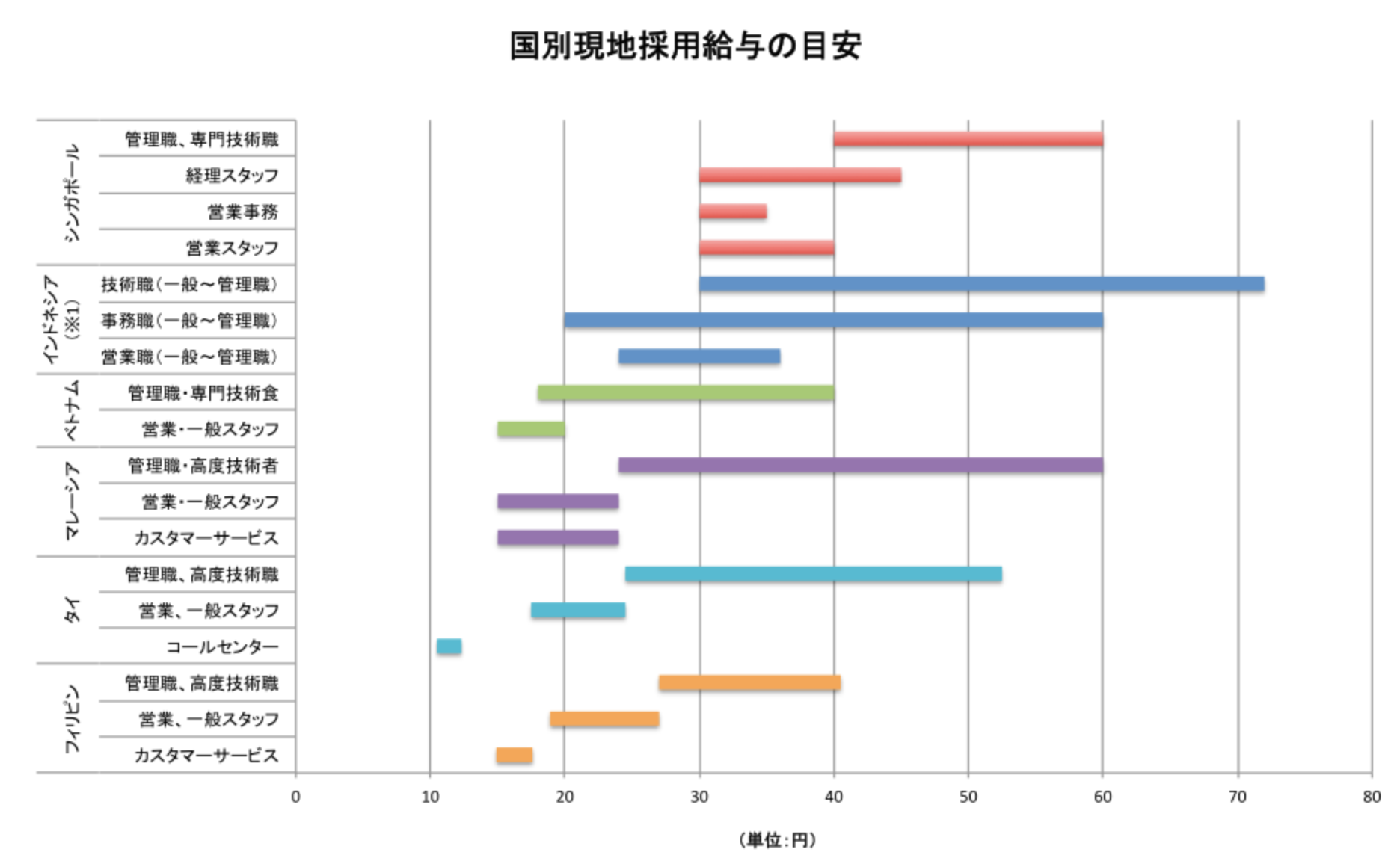 アジアで現地採用で就職をした場合の各国の一般的な給与水準は以下になります。