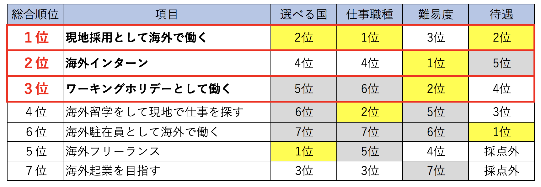ここまで、海外で働く方法とそれぞれのメリット・デメリットについて見てきました。次にそれぞれの方法を、<選べる国><選べる職種><難易度><待遇>で点数をつけて<総合ランキング>を発表します!