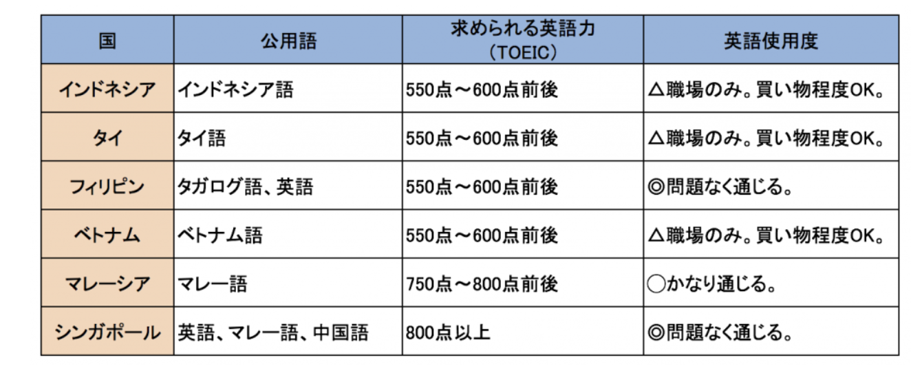 シンガポールとマレーシアはかなりの英語力を求められますが、それ以外の国ではさほど高い語学力を求められることはありません。
