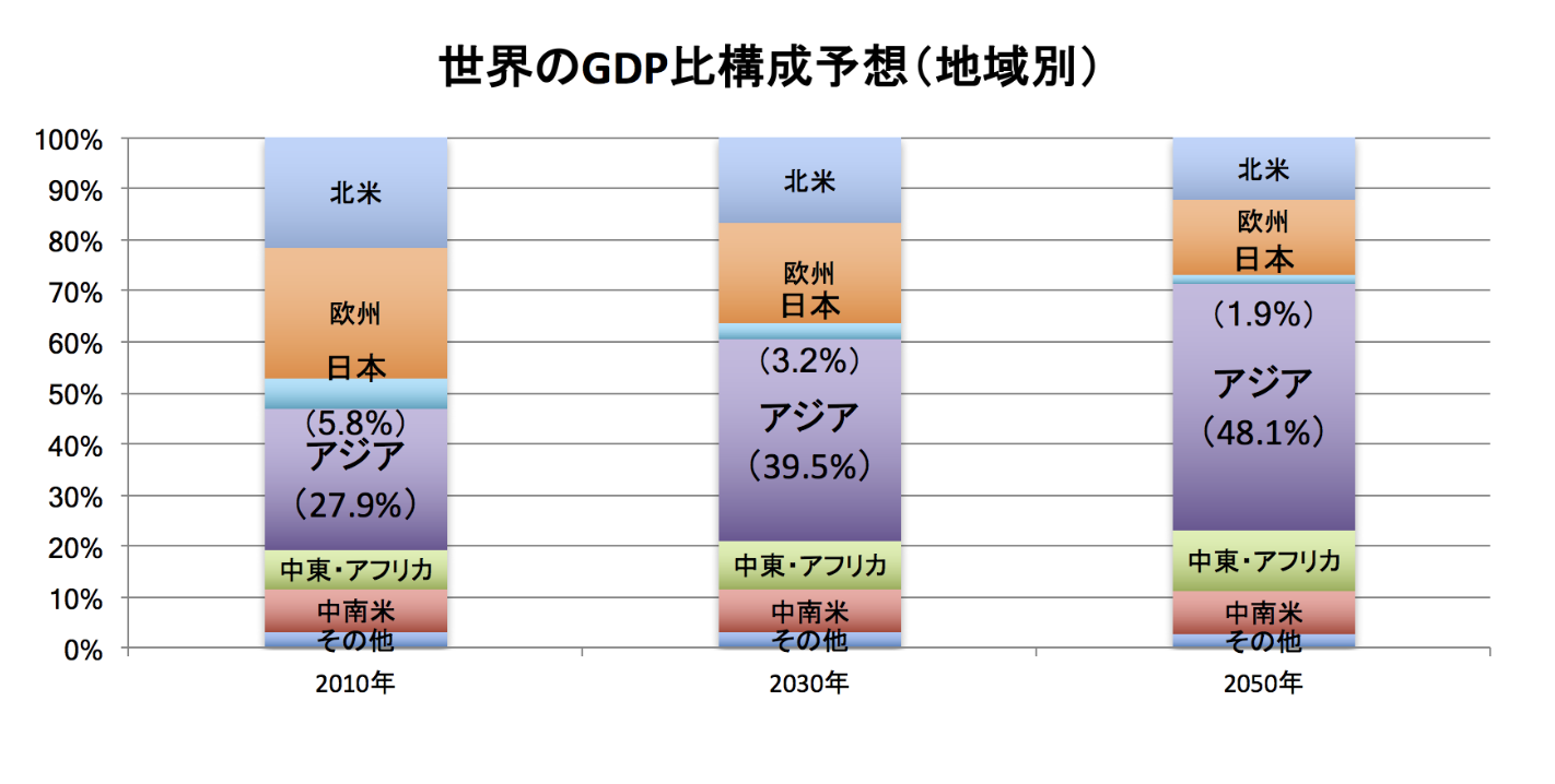 また、以下は2010年、2030年、2050年の世界経済における各地域のシェアの予想したグラフになります。