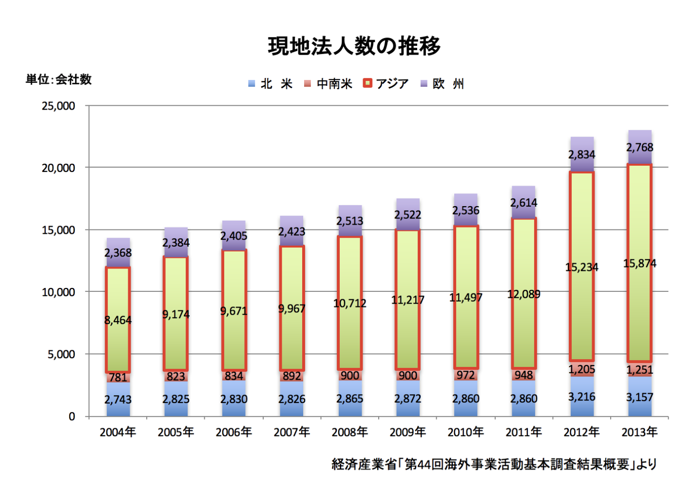 上記のグラフをご覧になっていただければ明らかなように、アジアを中心に日系企業の進出は続いており、それに伴い海外現地法人での日本人の需要は高まっています。一方で北米や欧州への日系企業の進出はあまり進んでいないこともご理解いただけると思います。